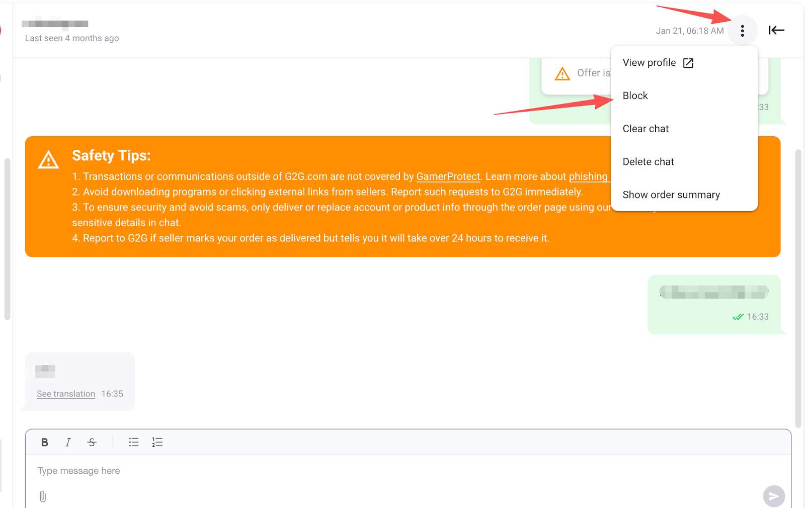 Sistem chat G2G menyediakan fitur Blokir dan Laporkan. Apabila Anda menemukan konten tidak pantas atau pengguna yang melanggar aturan G2G, kami sangat menyarankan Anda untuk memblokir pengguna tersebut dan melaporkannya kepada G2G. Tim khusus dari G2G akan meninjau laporan, segera melakukan intervensi, menyelidiki kasus tersebut, dan mengambil tindakan yang diperlukan.